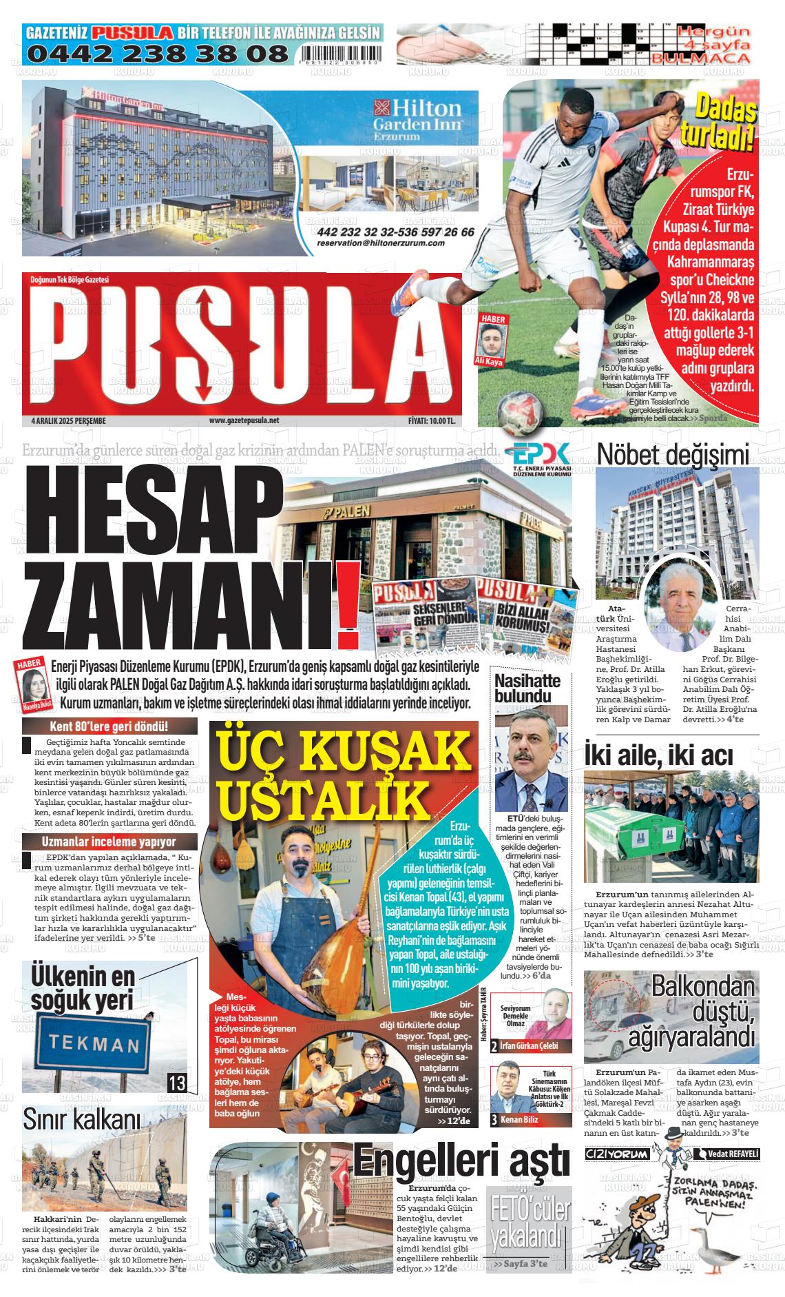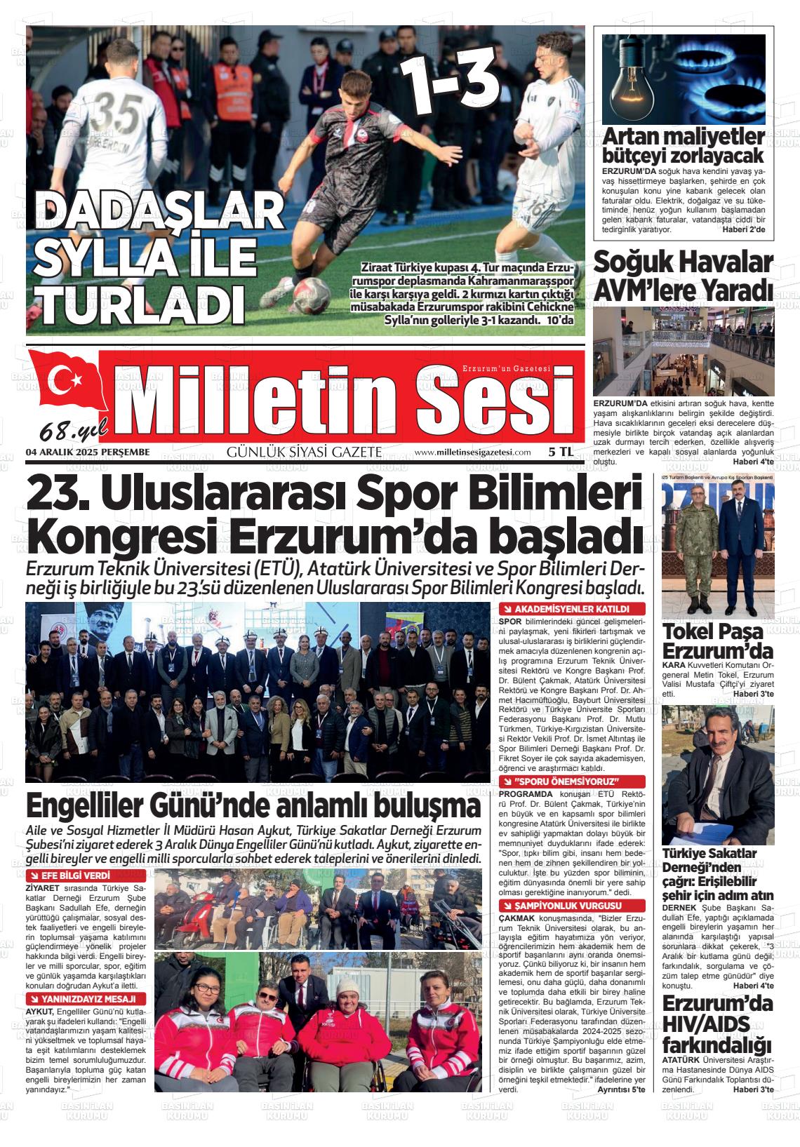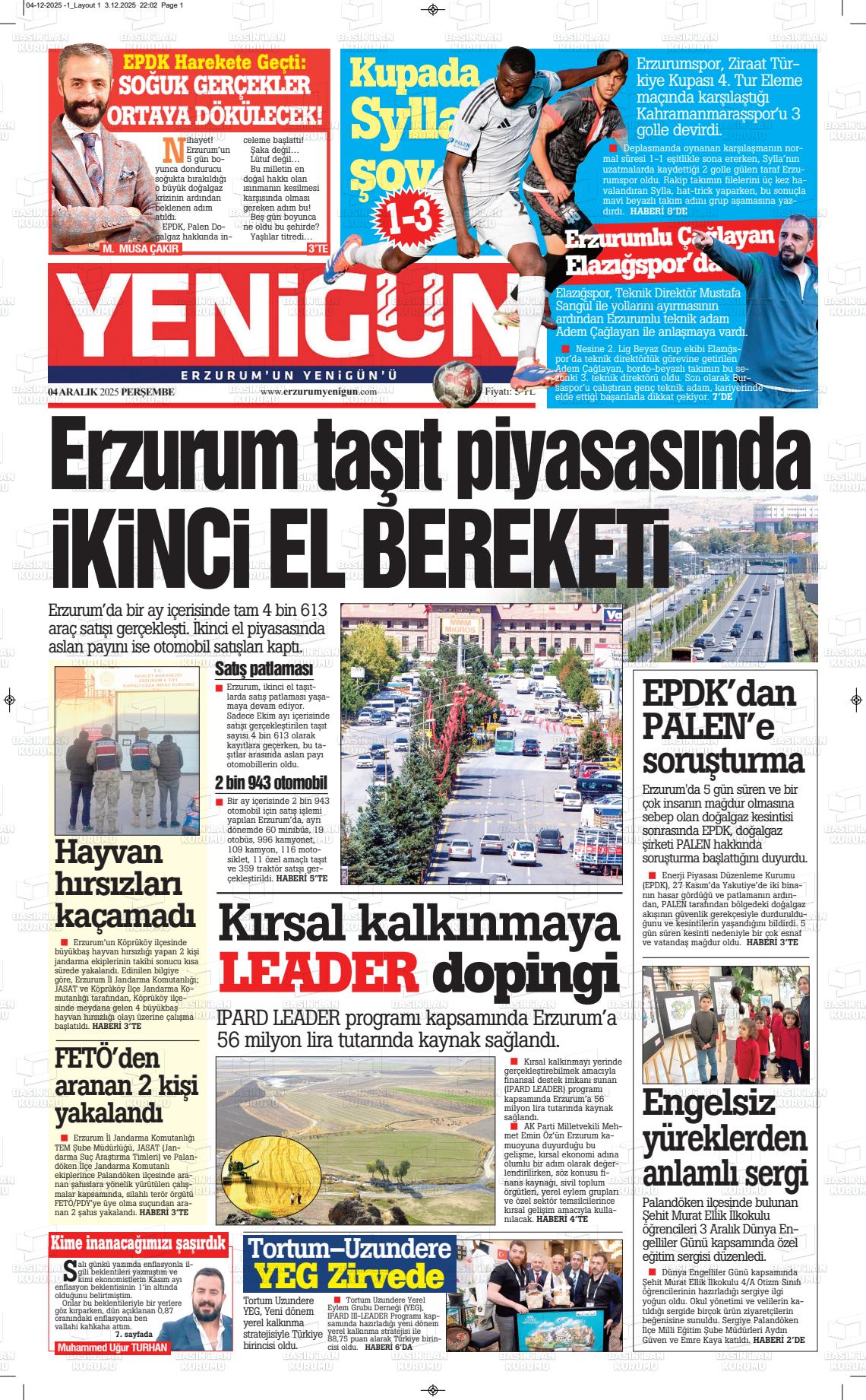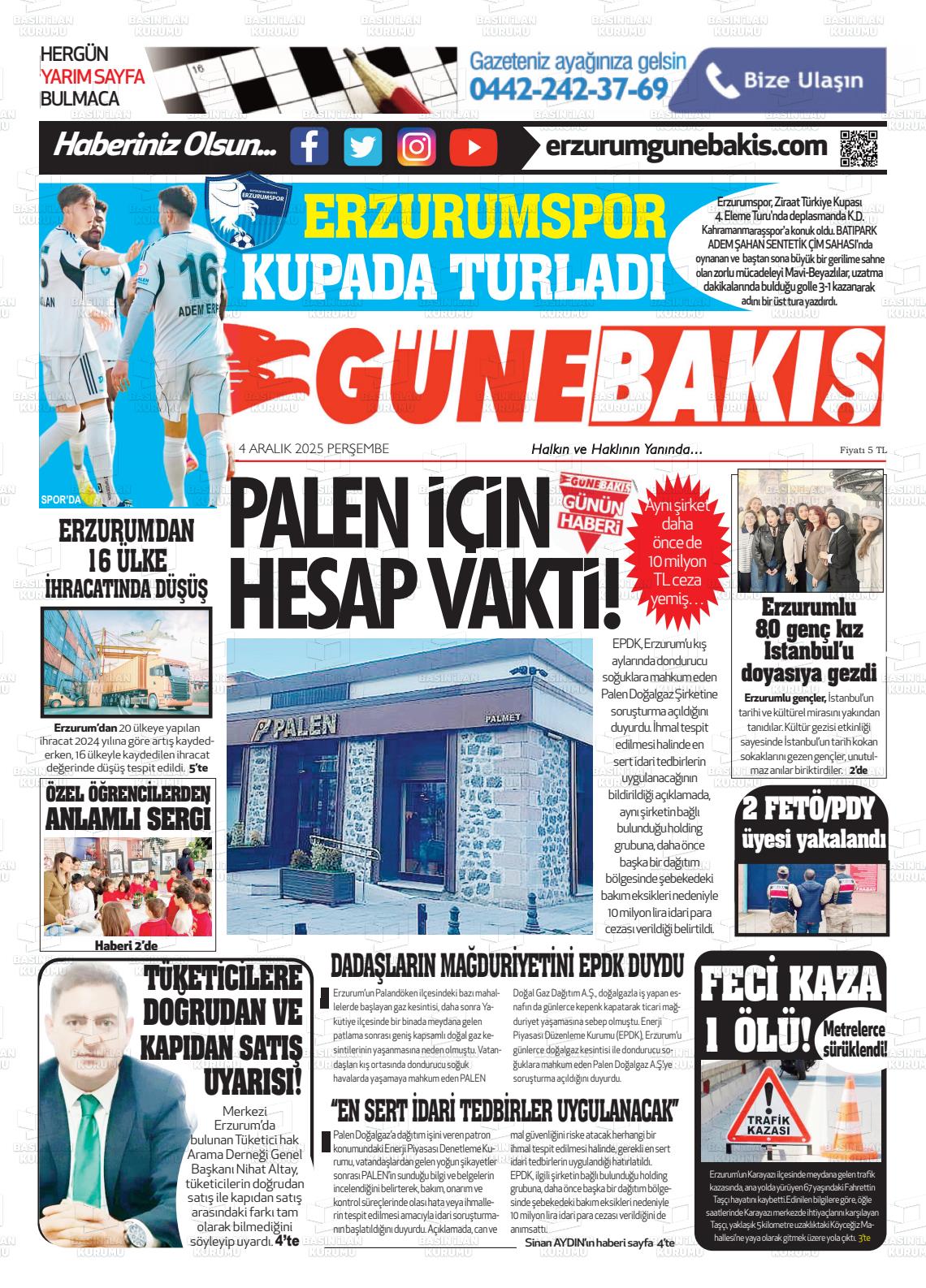 Erzurum Yerel Gazeteleri 29 Ocak 2026, Perşembe Günü Manşeti