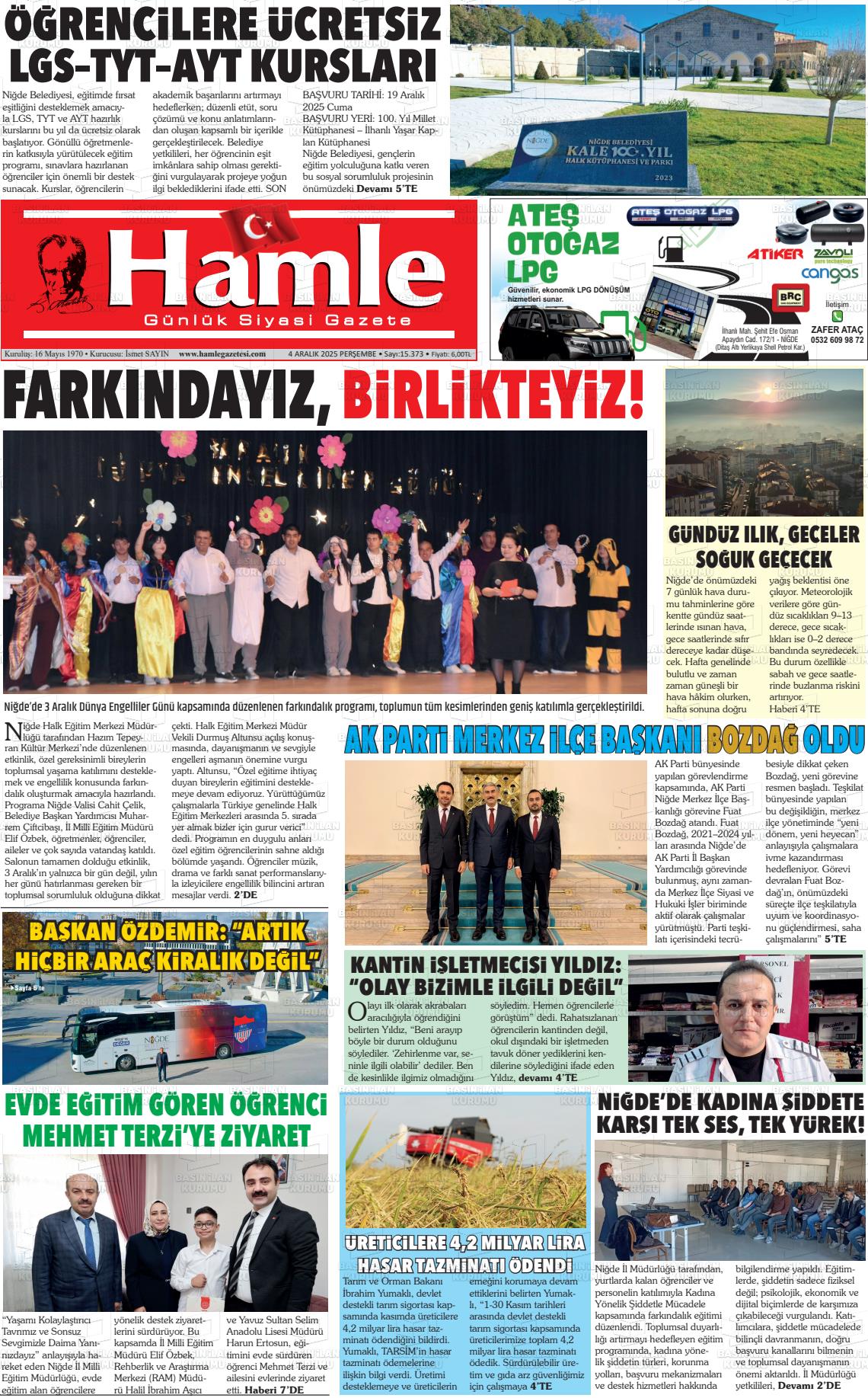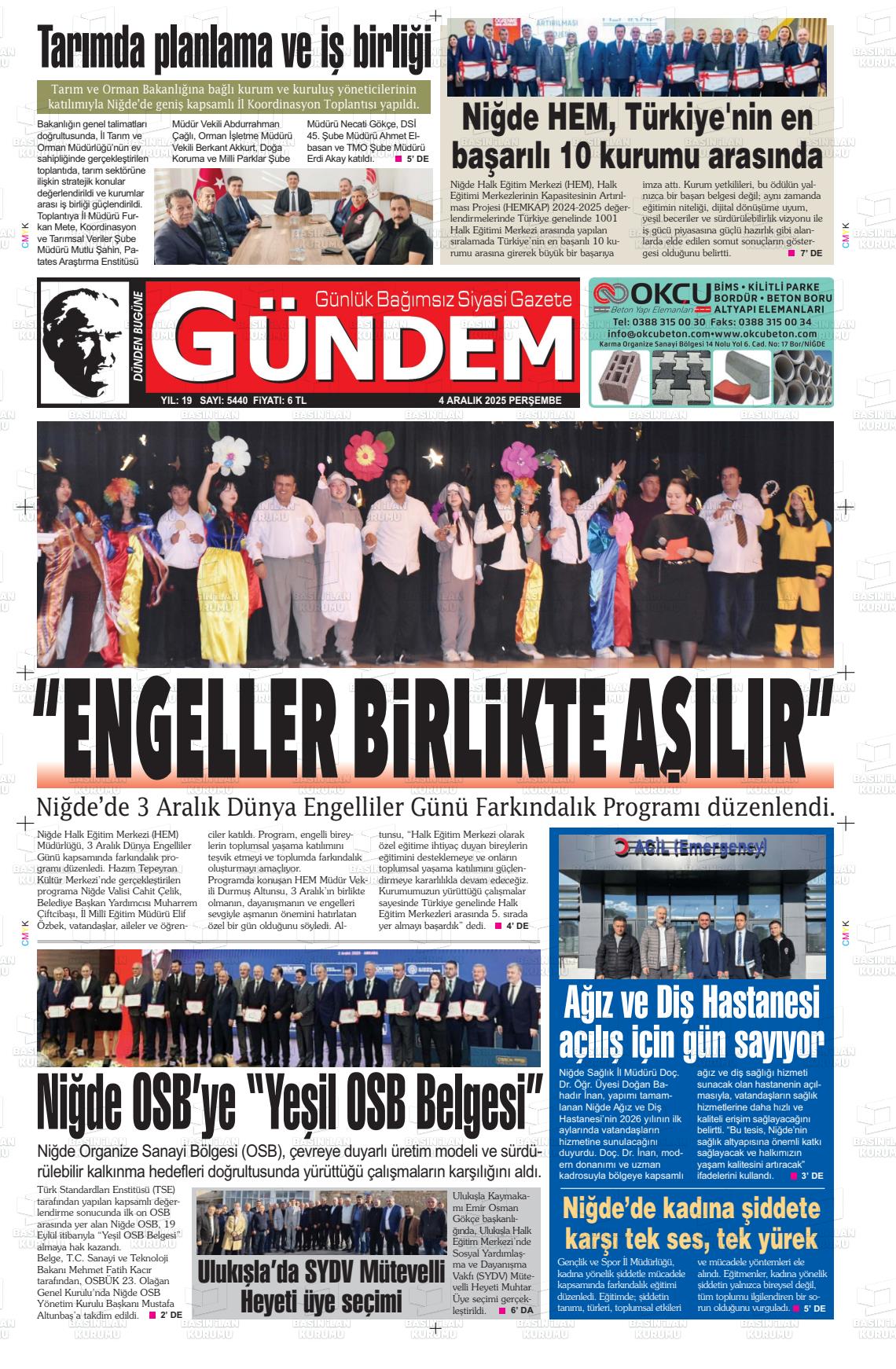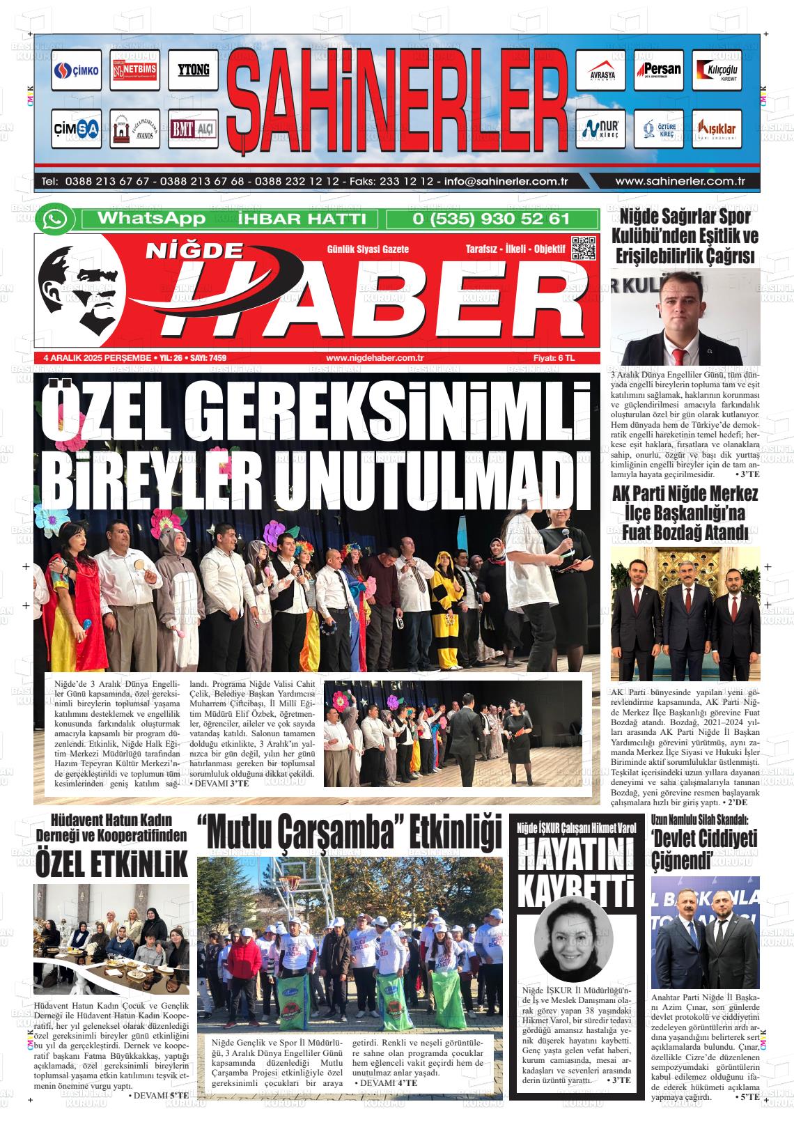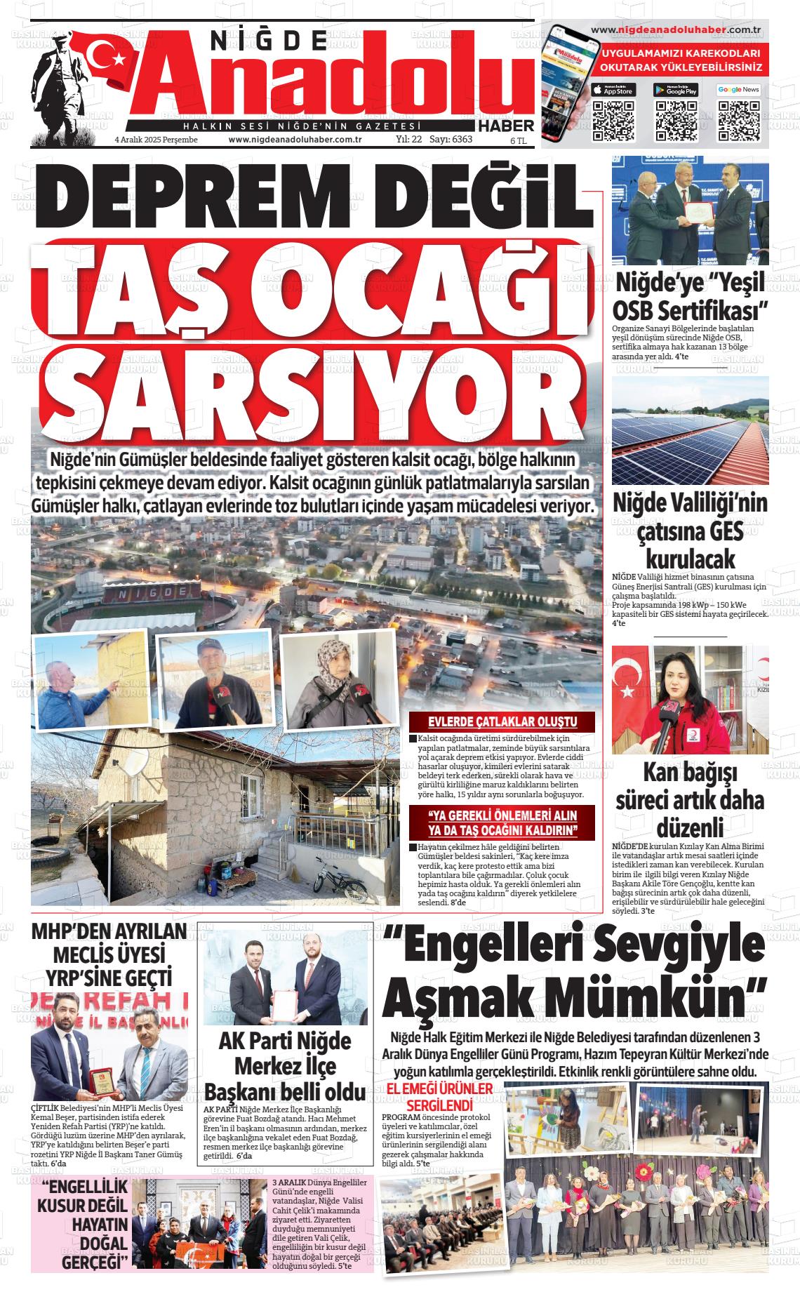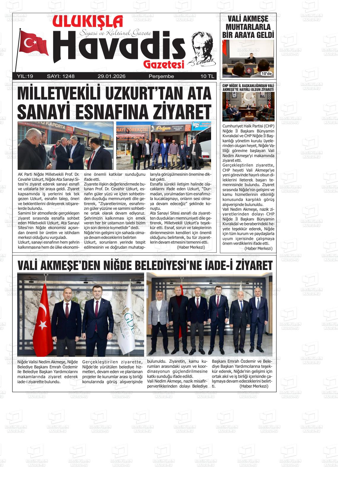 Nİğde Yerel Gazeteleri 29 Ocak 2026, Perşembe Günü Manşeti