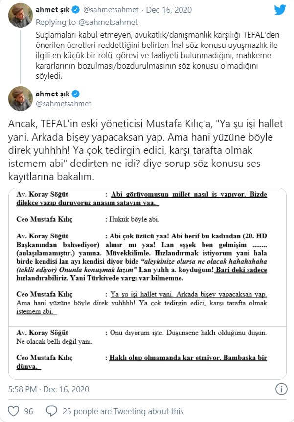 Bağımsız İstanbul Milletvekili ve gazeteci Ahmet Şık, Erdoğan’ın yakınındaki avukat ve yargı mensuplarının davanın seyrini değiştirdikleri, Türkiye’de de çok iyi bilinen bir Fransız firmasını kurtarmak için bir araya gelen kişilerin ses kayıtlarını Twitter hesabından aktardı.