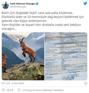 * Bizim için doğadaki hiçbir cana asla paha biçilemez…Dürbünlü silahı ve 50 mermisiyle dağ keçisini katletmek için gelecek olan kişiye sesleniyorum. Yarın köylüler ve duyarlı tüm dostlarla orada seni bekliyor olacağım…