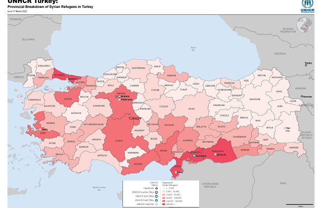 Birlemiş Milletler, Mart 2022 itibarıyla Suriyelilerin illere göre dağılımını açıkladı.