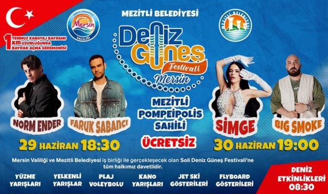 Mezitli Belediye Başkanı Ahmet Serkan Tuncer, festivalin tüm Mersinliler için büyük bir fırsat olduğunu belirterek, “Deniz Güneş Festivali, sadece eğlencenin ve müziğin değil, aynı zamanda denizle buluşmanın da en güzel adresi olacak. Hemşehrilerimizi veşehrimize gelen misafirlerimizi bu coşkulu etkinliğe davet ediyorum” dedi.