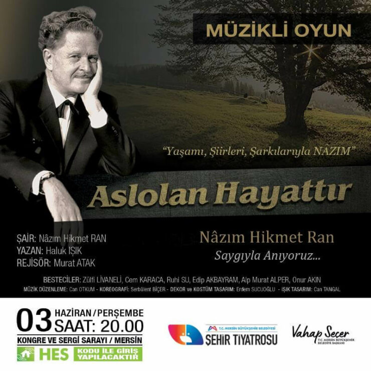 Mersin Büyükşehir Belediyesi Şehir Tiyatrosu, ünlü şair Nazım Hikmet Ran’ı ölümünün 58. yıl dönümünde sahneleyeceği oyun ile anacak. Şehir Tiyatrosu oyuncuları tarafından sahnelenecek olan “Aslolan Hayattır” isimli müzikli oyun, 3 Haziran Perşembe günü saat 20.00’de Kongre ve Sergi Sarayı’nda Mersinli tiyatroseverlerle buluşacak.