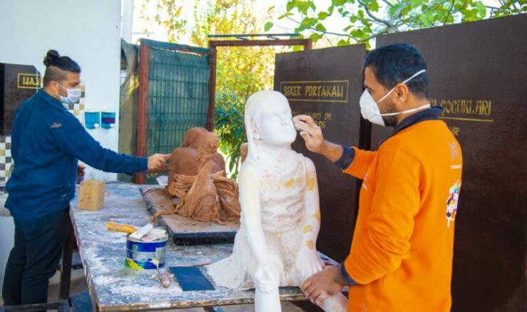 Park ve Bahçeler Dairesi’nde görevli Heykeltıraş Okan Apak ve Serdal Özdemir, Adnan Menderes Bulvarı Mersin Marina karşısındaki Bölge Park içerisinde oluşturulan Okuma Alanı’na özel, okuyan çocuk heykelleri hazırladı. Heykeltıraş Okan Apak, 4 adet kitap okuyan çocuk heykeli ve 3 adet kitaptan oluşan kompozisyon çalışmasına killeme ve modelleme teknikleri ile başladıklarını kaydetti. Yapım aşamasında öncelikle bir demir konstrüksiyon hazırlayarak, heykellerin ve çamurun ayakta durabilmesini sağladıklarını söyleyen Apak, “Daha sonra çamuru kendi tasarımımıza göre modelleme yapıyoruz. Modellikten sonra kalıp alıyoruz. Sonraki aşamada ise polyester dökümüne, dışarda kalabilecek şekilde döküm yapıyoruz” dedi.