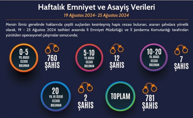 Mersin Valiliği, 19-25 Ağustos 2024 tarihlerinde gerçekleştirilen emniyet ve asayiş çalışmalarının sonuçlarını açıkladı. İl Emniyet Müdürlüğü ve İl Jandarma Komutanlığı tarafından yürütülen operasyonlarda, çeşitli suçlardan kesinleşmiş hapis cezası bulunan toplam 781 şahıs yakalanarak adli mercilere teslim edildi.