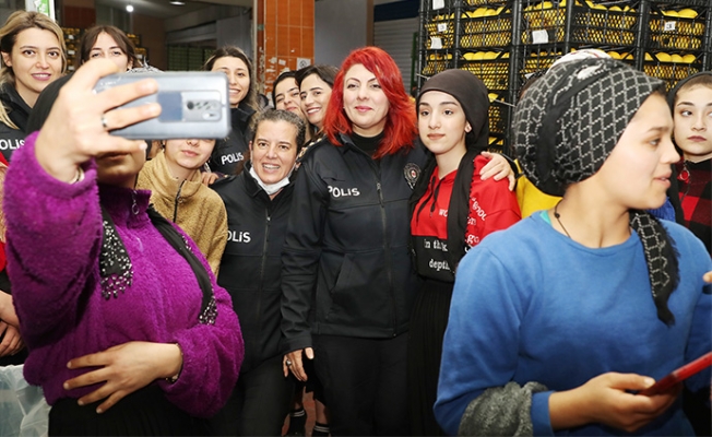 Emniyet Müdürlüğü kadrosunda görevli kadın müdürler, amirler ve memurlar, 8 Mart Dünya Kadınlar Günü kapsamında Mersin Hal Kompleksinde çalışan kadınları ziyaret etti.