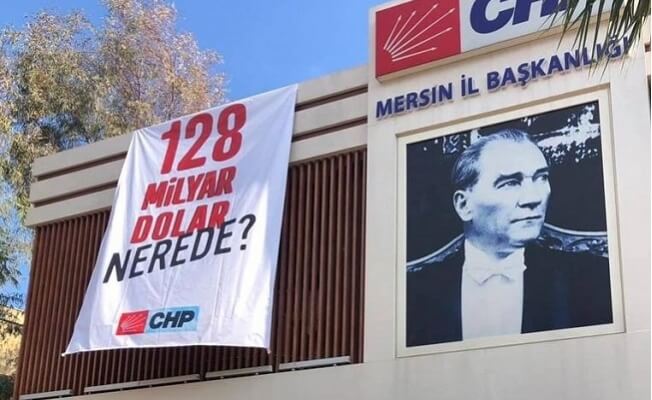 CHP Mersin İl Başkanı Adil Aktay’ın konuşmasını yaptığı sırada “128 milyar dolar nerede?” afişi parti binasına asıldı. Basın toplantısına katılanlar ise alkışlar eşliğinde “Gün gelecek AKP halka hesap verecek” şeklinde sloganlar attı.