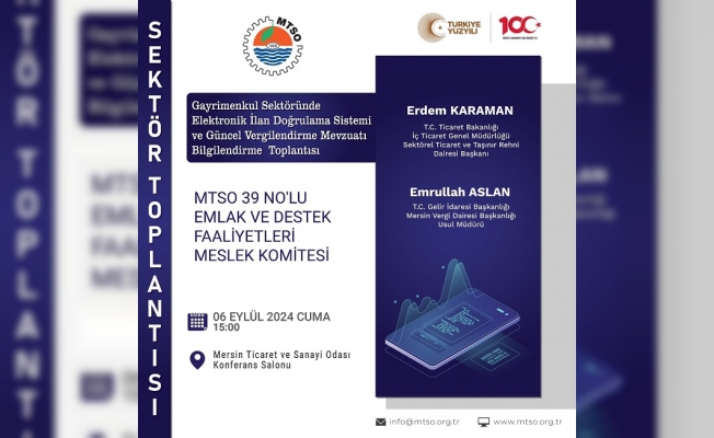 Mersin Ticaret ve Sanayi Odası (MTSO) 39 No’lu Emlak Destek Faaliyetleri Meslek Komitesi, gayrimenkul sektörüne yönelik önemli bir bilgilendirme toplantısı düzenliyor. 6 Eylül Cuma günü gerçekleştirilecek toplantıda, “Gayrimenkul Sektöründe Elektronik İlan Doğrulama Sistemi ve Güncel Vergilendirme Mevzuatı” konuları ele alınacak.