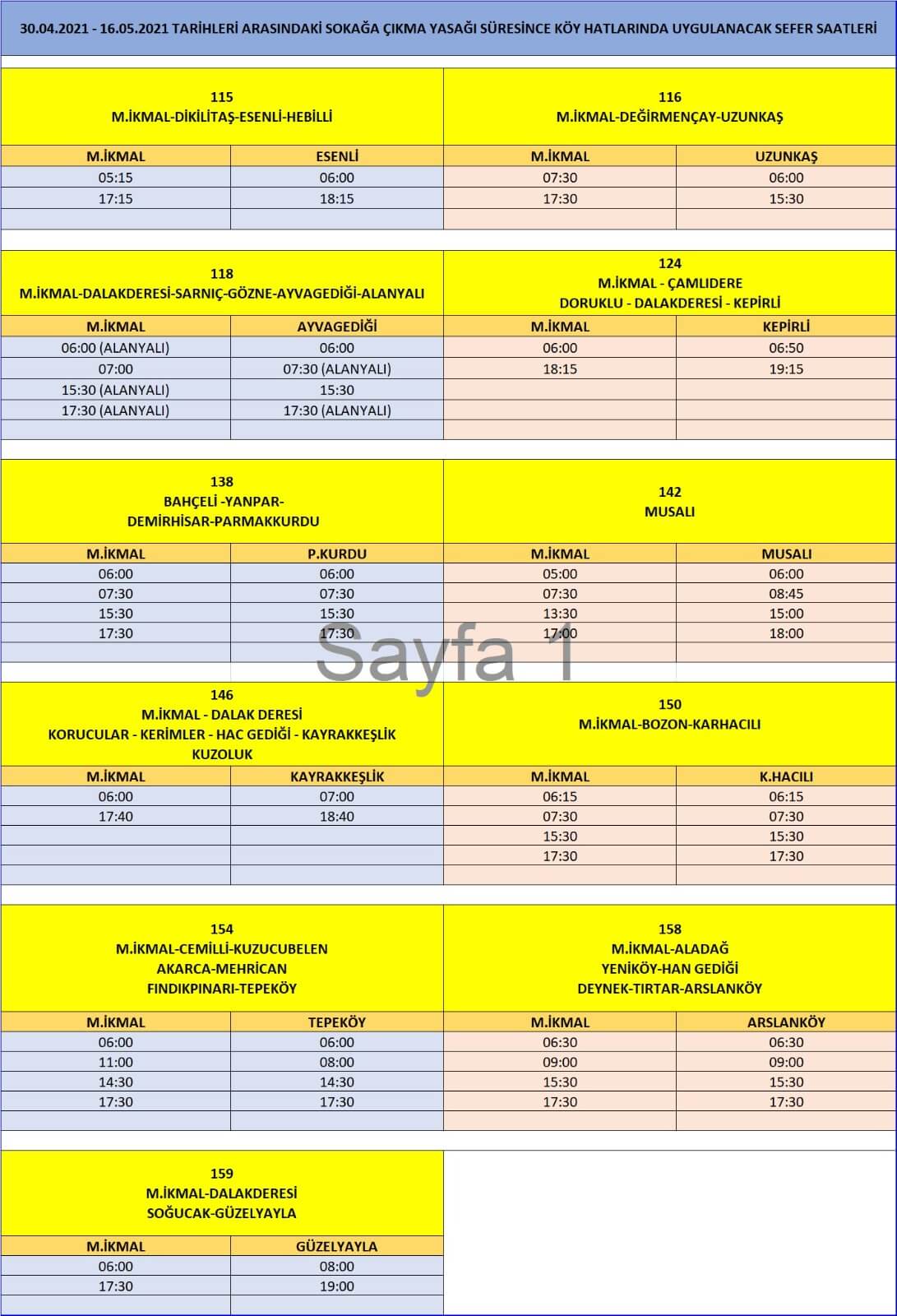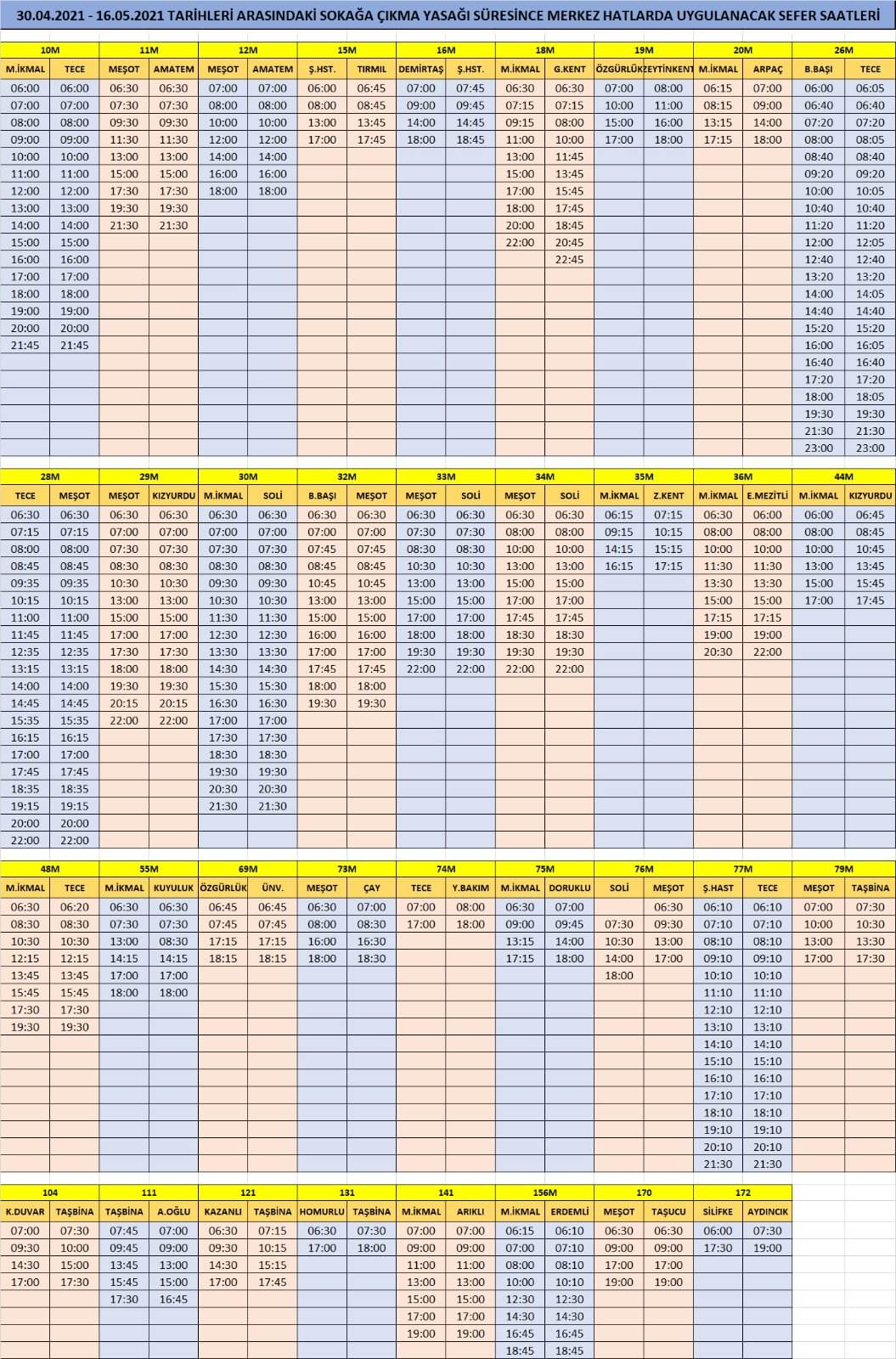 30 Nisan Cuma ile 16 Mayıs tarihleri arasında sokağa çıkma yasağı sürecince uygulanacak sefer saatlerine aşağıdajn bakabilirsiniz.