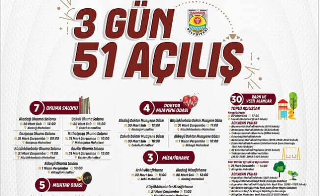 Yapılacak bu açılışlara ek olarak düzenlemeleri tamamlanan park ve yeşil alanların halkın hizmetine sunulmasıyla birlikte 51 adet hizmetin açılışları gerçekleştirilmiş olacak.