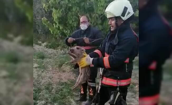 Mersin’in Tarsus ilçesi Kaleburcu Mahallesinde bulunan boş durumdaki sulama havuzunun içerisine düşen yavru domuzun sesini duyan çevredeki vatandaşlar, durumu itfaiye ekiplerine bildirdi.