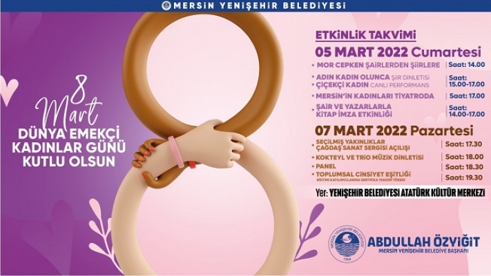 Yenişehir Belediye Başkanı Abdullah Özyiğit, tüm vatandaşları 8 Mart Dünya Emekçi Kadınlar Günü etkinliklerine davet etti. Yenişehir Belediyesi ilk olarak Yenişehir Kent Konseyi ile Mersin Şairler ve Yazarlar Derneği işbirliği ile 5 Mart Cumartesi günü Yenişehir Belediyesi Atatürk Kültür Merkezinde bir dizi etkinlik gerçekleştirecek. Program ilk olarak saat 14.00’de “Mor Cepken Şairlerden Şiirlere” etkinliği ile başlayacak. 15.00- 17.00 saatleri arasında ise “Adın Kadın Olunca” şiir dinletisi ile “Çiçekçi Kadın” adlı canlı performansı Mersin Şairler ve Yazarlar Derneği bünyesindeki sanatçılar sahneleyecek.